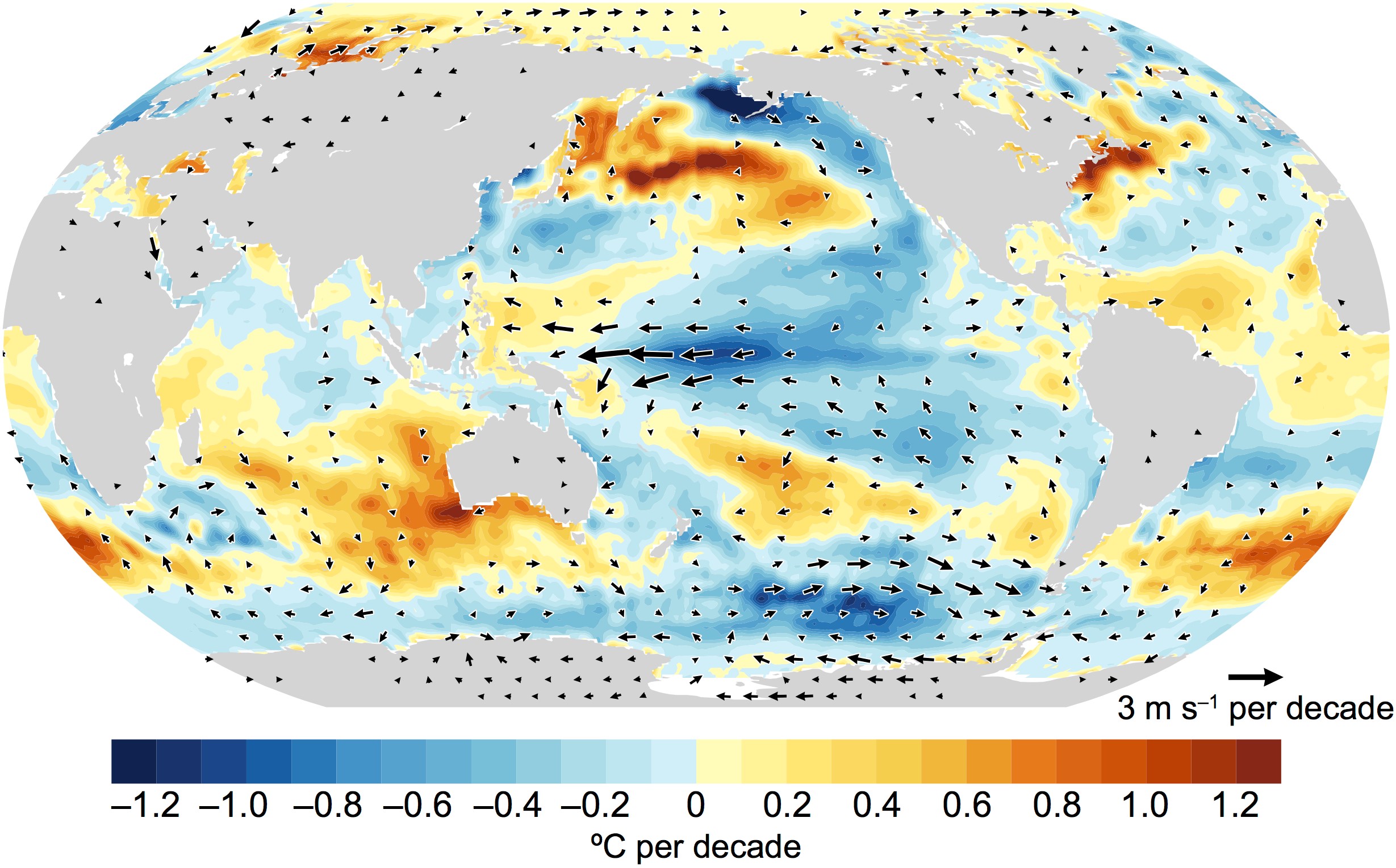 気候は人類による温室効果ガスやエアロゾル等の排出に応答して変化するだけでなく、気候システムに内在するプロセスによって自励的に変動します。この自然変動は時空間的に組織化されて様々な現象を生み出します。この気候の自然変動現象はどのようにして形成されるのでしょうか。また、産業革命以降に気候の様々な側面で起こった移り変わりに対し、人類による駆動要因や様々な自然変動現象は、それぞれがどのようにして、どれだけ寄与してきたのでしょうか。その理解は私たちの気候システムに対する理解を試す高度な取り組みであるとともに、未来の気候を予測する上での基礎情報になります。