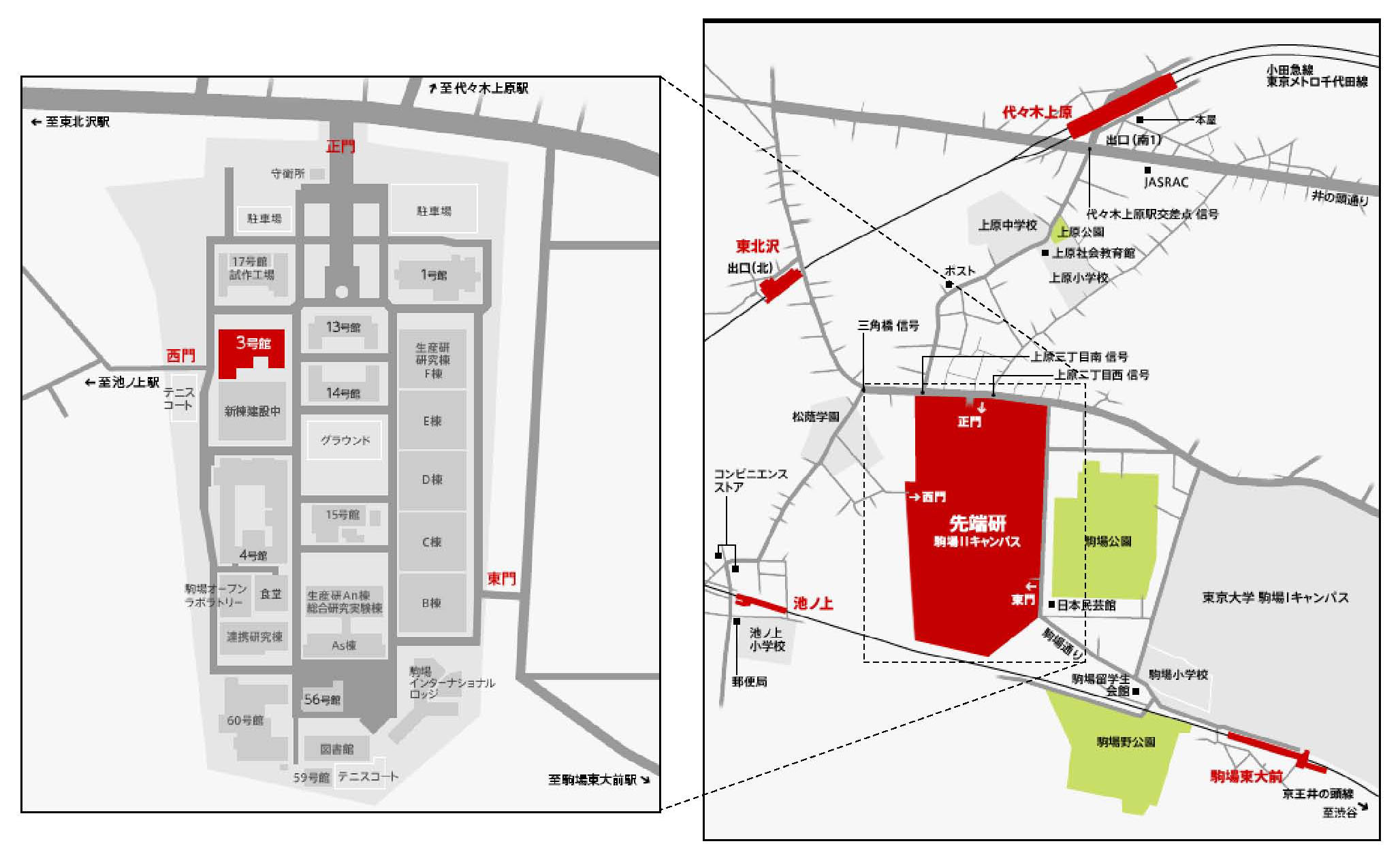 本郷キャンパスから1時間弱です。根津から代々木上原まで地下鉄千代田線をご利用下さい。他に、地下鉄大江戸線・本郷三丁目-新宿西口、小田急線・新宿-東北沢の経路も可能です。